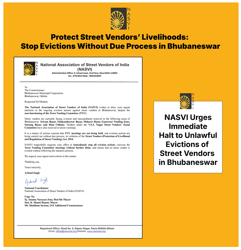 NASVI has formally written to the Bhubaneswar Municipal Corporation, urging an immediate halt to eviction drives against street vendors being carried out without a functional Town Vending Committee.