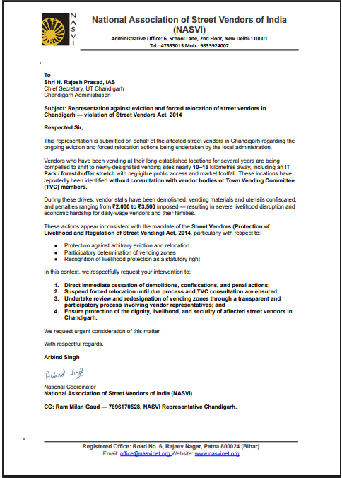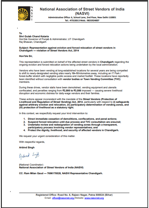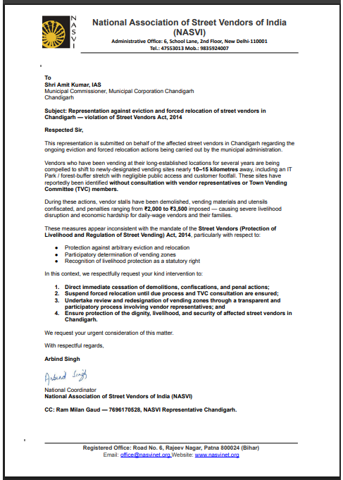 Following the ongoing harassment, excessive fees, and denial of basic vending rights in Chandigarh, NASVI has formally written to the Chief Secretary, the Hon’ble Governor, and the Municipal Commissioner of Chandigarh.